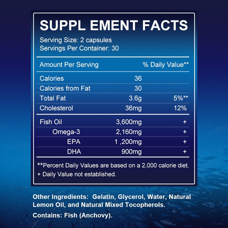 Not all omega‑3 supplements deliver superior quality. The omega‑3 in our fish oil provides essential fatty acids including EPA and DHA, which help reduce inflammation and support overall health and wellness. Our premium omega‑3 fish oil is 100% natural, pure, and free of artificial additives. Each serving supplies 3600mg of fish oil, with 864mg DHA and 1296mg EPA.