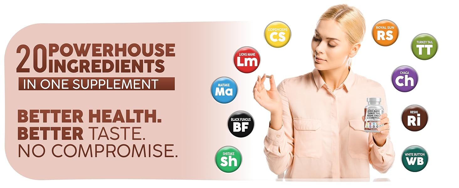 Advanced Mushroom Complex For Women And Men – Our mushrooms supplement includes 20 different types of mushroom extract such as lions mane mushroom capsules, turkey tail mushroom extract, reishi mushroom powder, chaga mushrooms capsules, and cordyceps sinensis. A potent Lions Mane Mushroom Supplement with lions mane extract has been created and the results are amazing.