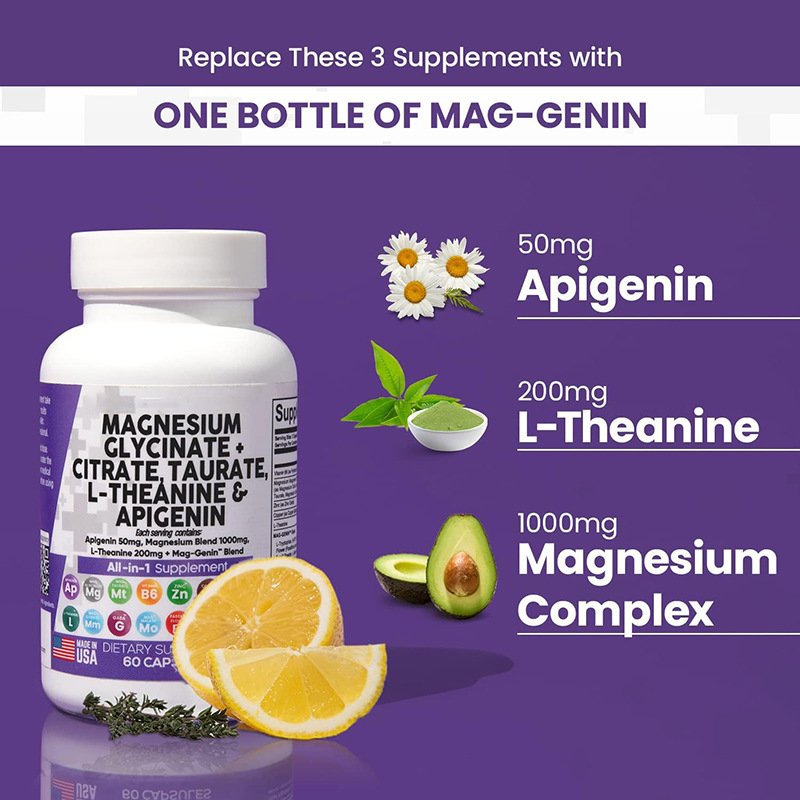 Combining full doses of magnesium taurate, glycinate, citrate, 200mg L-theanine, and apigenin, this formula is more effective than most pure magnesium glycinate capsules, magnesium citrate liquids, 100mg L-theanine tablets, and magnesium glycinate liquids. This advanced formulation makes traditional magnesium malate capsules and basic chelated magnesium glycinate feel outdated.
