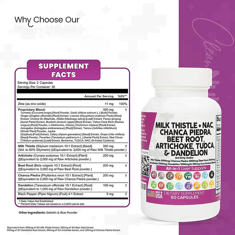 The Ultimate Milk Thistle & Chanca Piedra Capsules You’ve Been Looking For — This liver detox formula delivers five full‑dose essentials in one blend: chanca piedra, milk thistle, beet root powder, artichoke leaf extract and dandelion root powder, all in a convenient 2‑capsule serving. Milk thistle liver support, beet root, artichoke and dandelion extract are now combined into one simple solution.